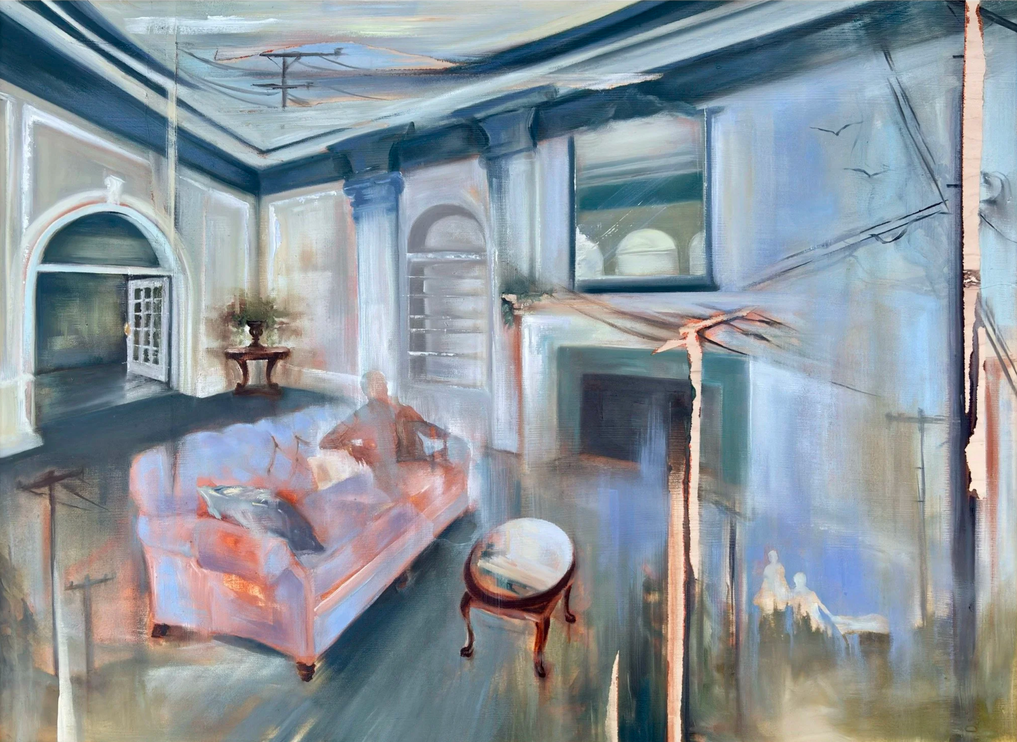 Through painting and mixed media, my work responds to the temporary and poignant moments and spaces that evoke feelings of nostalgia, longing, and memory. These scenes are exhibited in a way that establishes a context, interpretive to the audience but familiar to the mind. My work invites the viewer to visually inhabit these spaces—pass through waters, linger in the liminal spaces, and discover memories once lost, found in a seemingly normal reality.